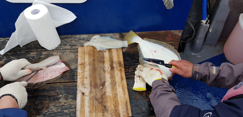 이틀전부터 추울정도로 바람이 불더니 오늘은 수온이 오히려 내려갔네요.오늘은 우럭낚시위주로 다녀왔습니다.우째 광어가 오징어채비에도 잘나오네요.생새우 외수질을 해봤는데 아직은 별로 인것같습니다.수온이 10도 전후라 생새우가 들어가면 바로 기절해서 미끼역활을 못하는군요.오늘 욕심을 좀 내봤는데 생각만큼 잘 나오진 않았습니다.배에서 시조회 하진분들땜에 7-8마리는 점심때 회떠서 회무침으로 뱃속으로 들어갔습니다.각자 쿨러는 못찍고 광어몇마리 잡은거만 올렸습니다.오늘도 모두 수고 많으셨습니다.감사합니다.