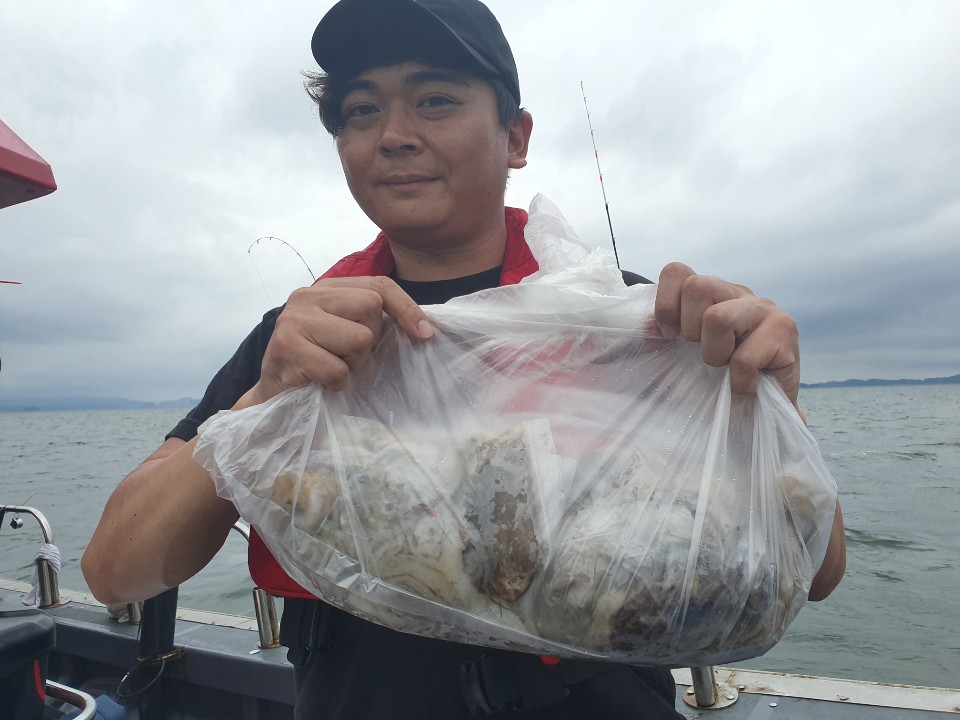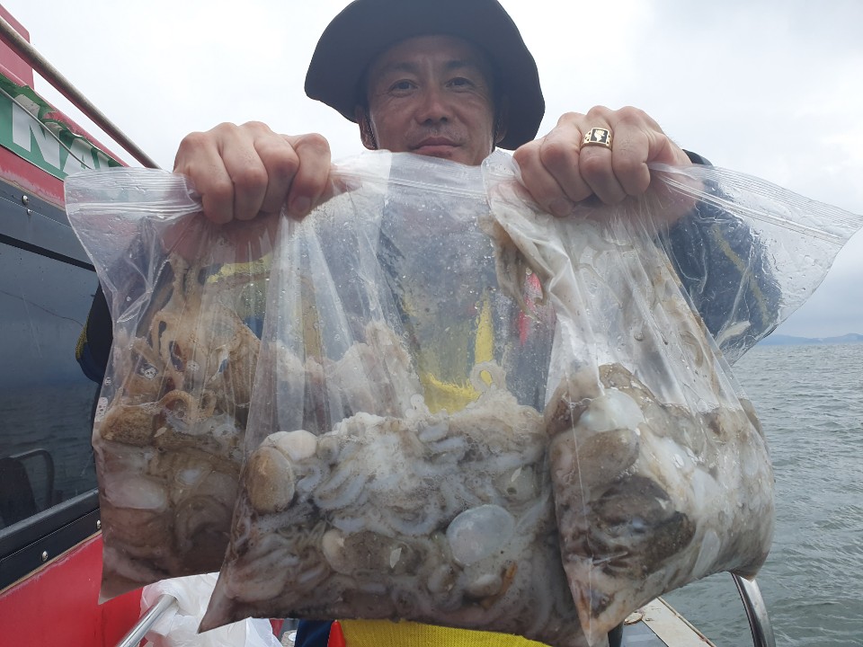 주꾸미3일차~꾸준히 나와준편이지만 어제와다르게 막쏟아지고 하지는않았네요~날도 흐린데 고생하셨습니다^^갑오징어가 잘나옵니다 이번년도 갑오징어 풍년일듯합니다^^자세한내용은 블로그로 놀러오세요 주꾸미3번째기념사진^^ 100수이상잡아주셨네요~ 주꾸미2번째 기념사진 80수정도잡아주셨습니다