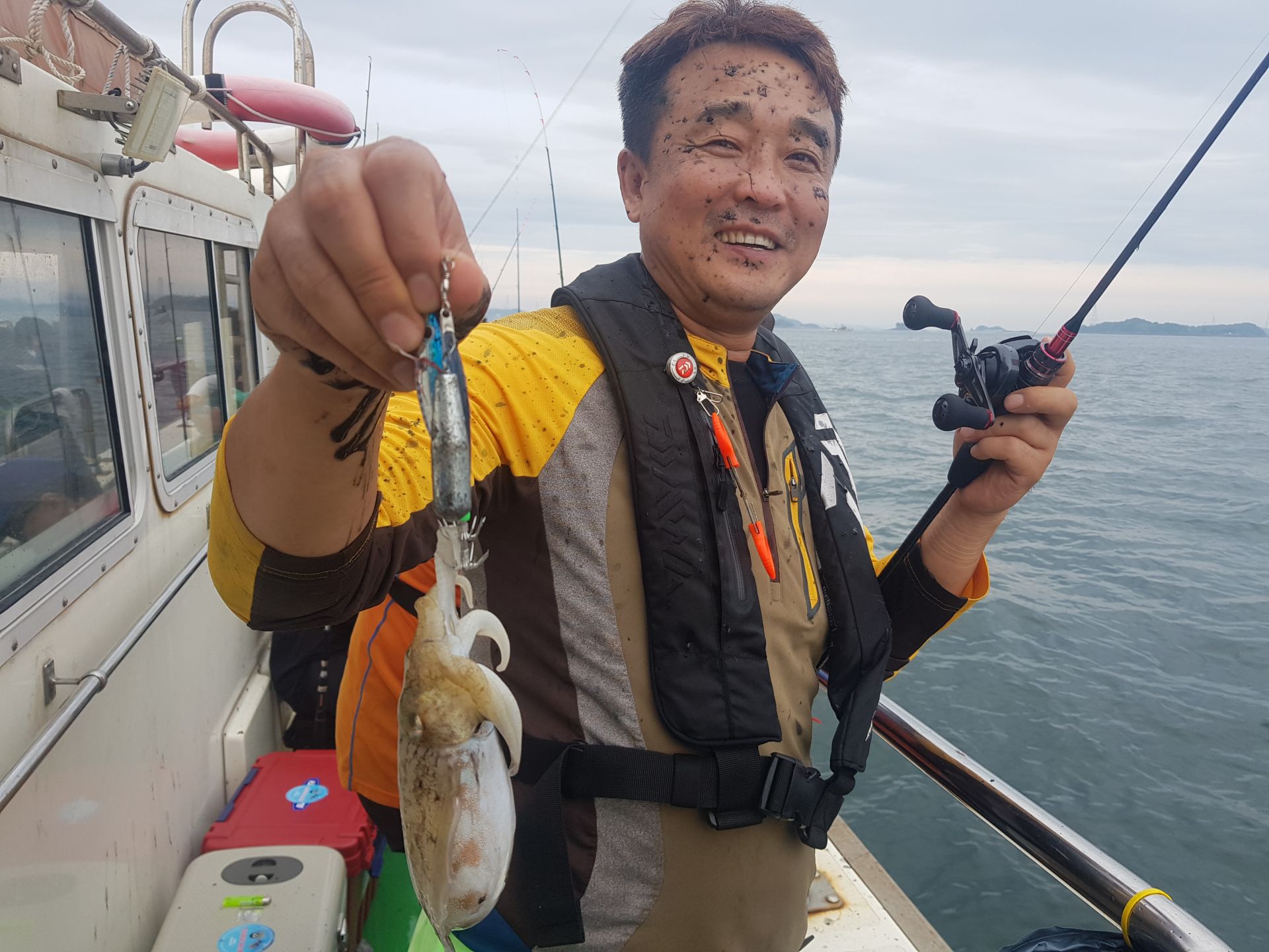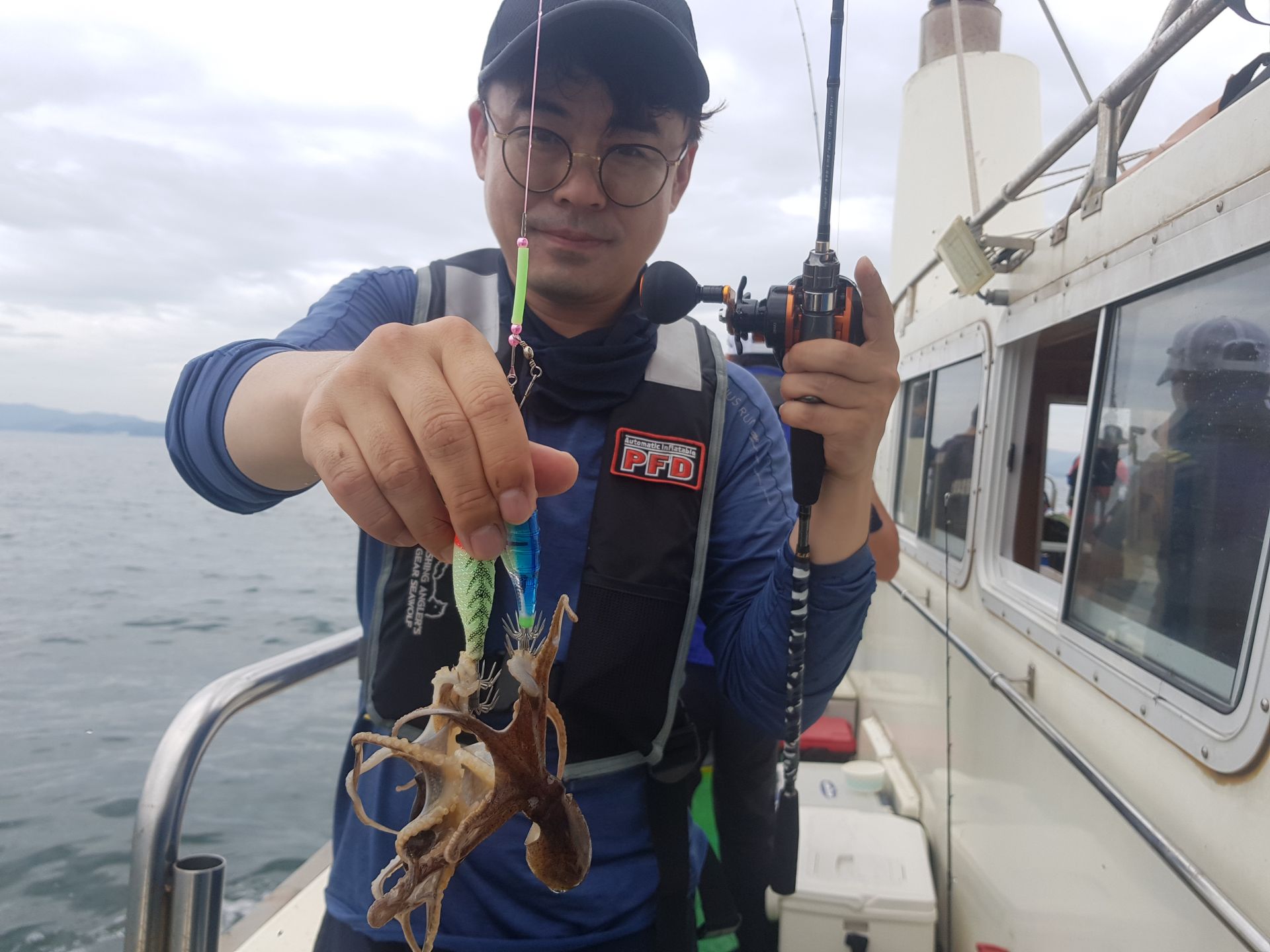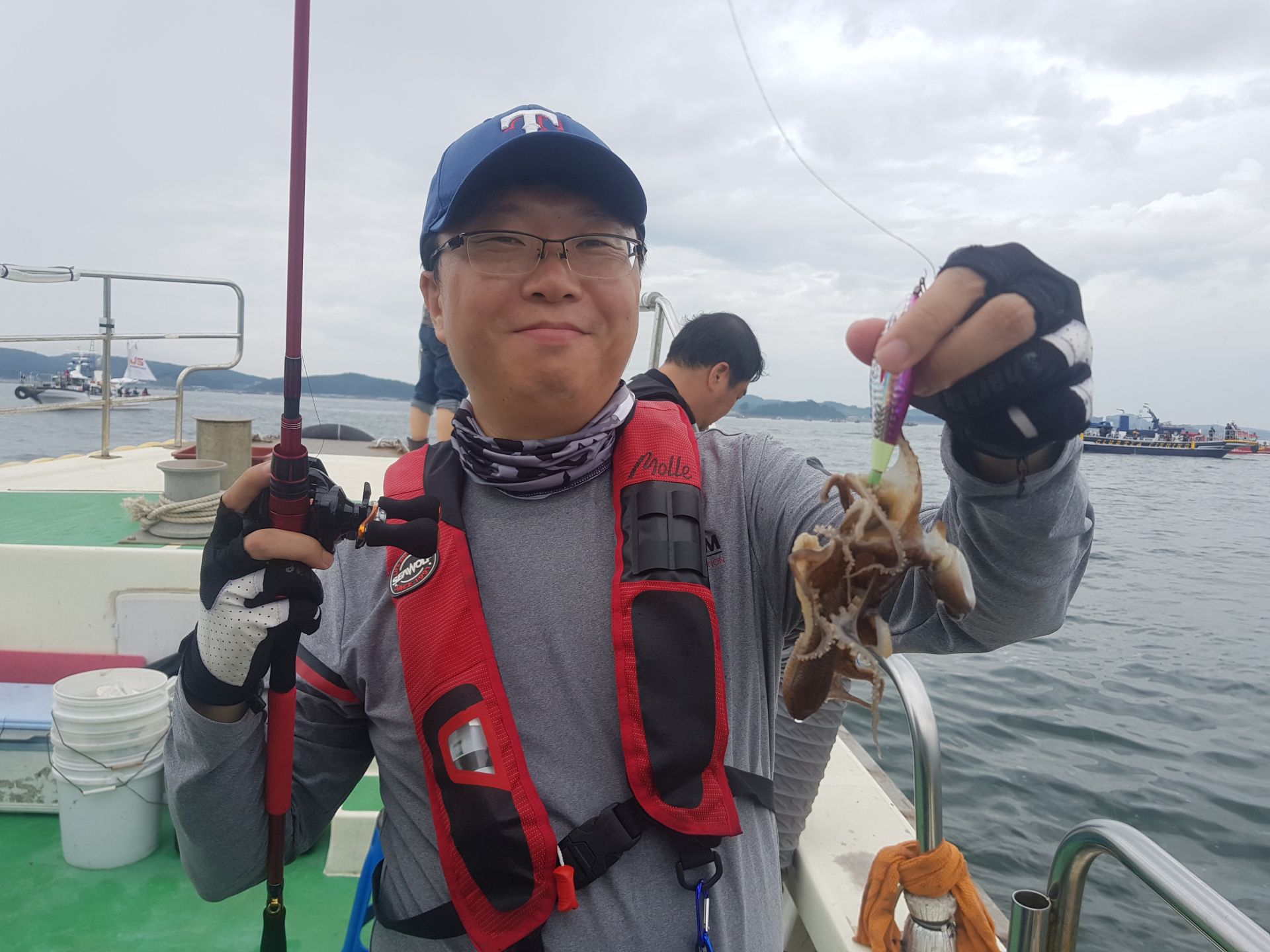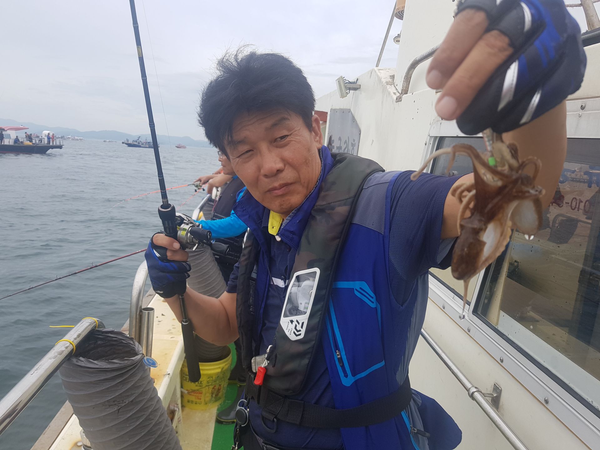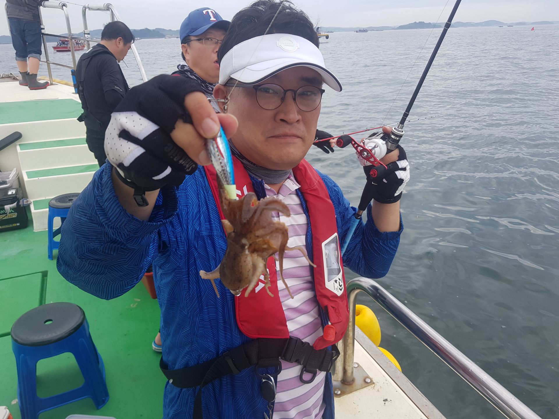 주꾸미3일차~꾸준히 나와준편이지만 어제와다르게 막쏟아지고 하지는않았네요~날도 흐린데 고생하셨습니다^^갑오징어가 잘나옵니다 이번년도 갑오징어 풍년일듯합니다^^자세한내용은 블로그로 놀러오세요  주꾸미3번째기념사진^^ 100수이상잡아주셨네요~ 주꾸미2번째 기념사진 80수정도잡아주셨습니다