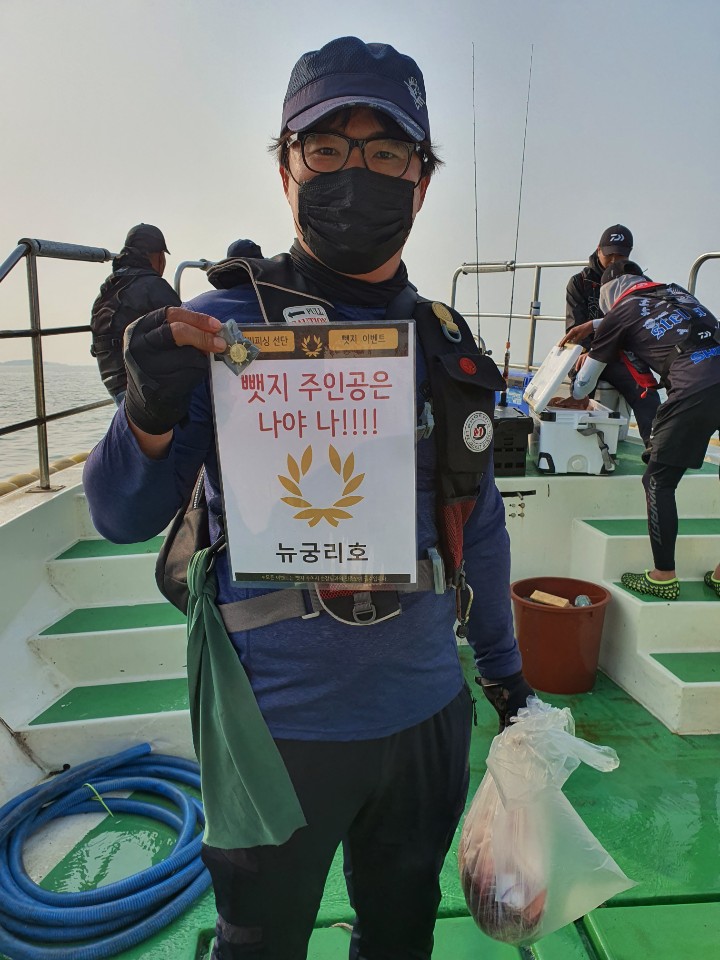 안녕하세요? 6월에도 뺏지 이벤트는 계속된다!!!!오늘 출항한 배들중 뺏지 조건이 맞는 배는 참돔 타이라바 대성1호였는데요~ 그렇담, 뺏지 주인공은 누구? 일까유?? 뺏지 주인공은 나아나~나야나!!김동학님이십니다.!! 벌써 두번째로 기억하는데요? 실력자이십니다.^^ 다음에 한번 참돔 같이 하고싶네요~ 축하드립니다.^^