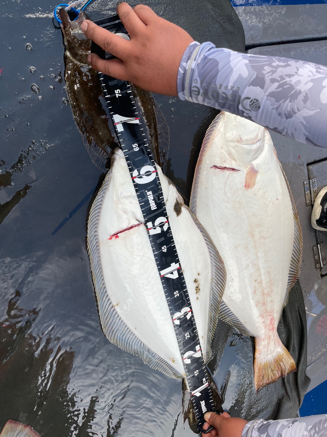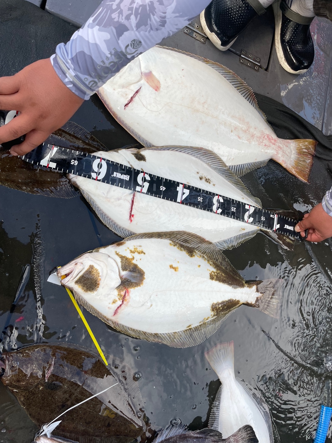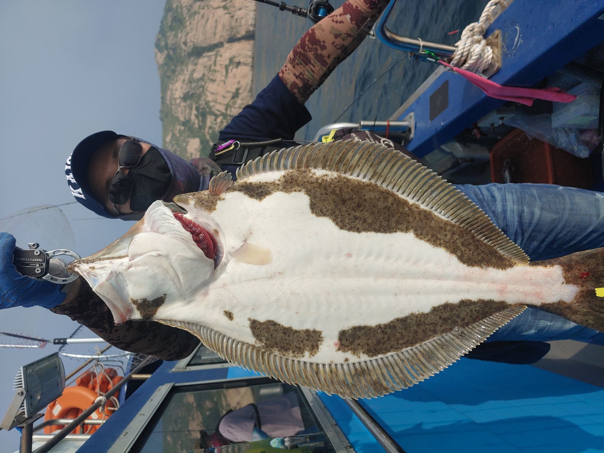 광어 첫 포인트 도착 삐~한마리 한마리 올라옵니다~ 오 조금 나올거 같은데~~~이어 두번째 흘리는데 주의에 많은 배들이모여 흘리기 시작합니다...그래서 두번째 포인트로 이동 와~대성호 한대뿐이라 정말 좋았습니다~~삐~~~우현 히트~~~조금뒤 좌현 히트~~선수 히트~ 3마리가 동시에 올라오는데 싸이즈가 싸이즈가~~첫 광어부터 6짜~5짜~6짜~~~대박 느낌이~와우~ 이후 한마리 두마씩 나오다가 7짜 대광어까지