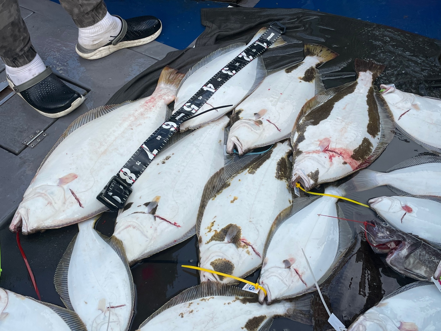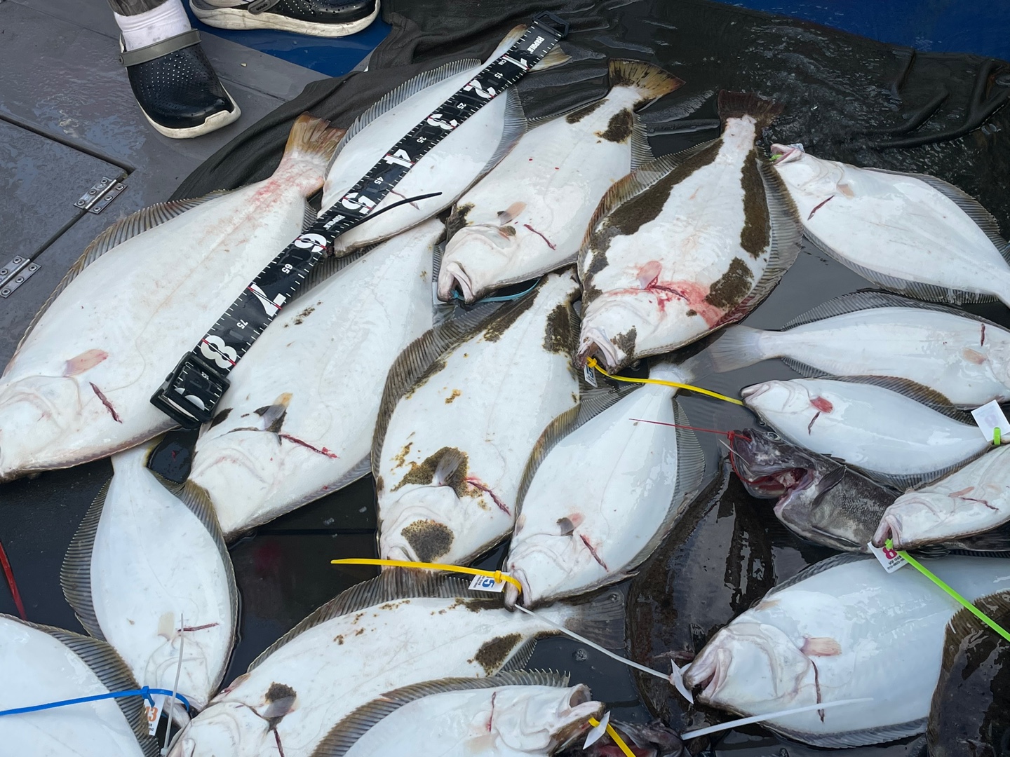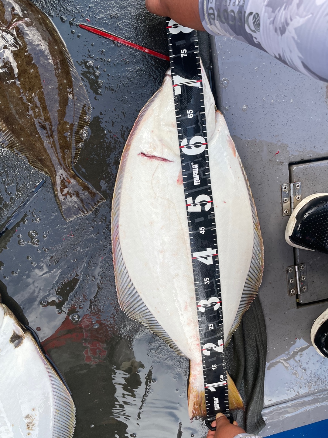 광어 첫 포인트 도착 삐~한마리 한마리 올라옵니다~ 오 조금 나올거 같은데~~~이어 두번째 흘리는데 주의에 많은 배들이모여 흘리기 시작합니다...그래서 두번째 포인트로 이동 와~대성호 한대뿐이라 정말 좋았습니다~~삐~~~우현 히트~~~조금뒤 좌현 히트~~선수 히트~ 3마리가 동시에 올라오는데 싸이즈가 싸이즈가~~첫 광어부터 6짜~5짜~6짜~~~대박 느낌이~와우~ 이후 한마리 두마씩 나오다가 7짜 대광어까지