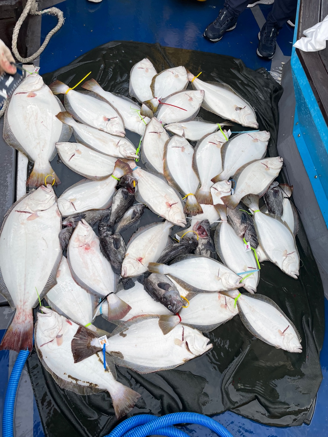 히트~히트~히트~ 쓰리히트~~그런데 말입니다 광어 얼굴 본건 한마리뿐 두분은 랜딩도중 빠트렸내요...다시 포인트 진입~삐~ 히트~히트~히트~히트~ 네분이 시간차를 두고 히트~그러나 광어 얼굴은 역시나 한마리뿐...아...진짜 울고싶더라구요... 그렇게 하루종일 빠지고 털리고 평소에 잘 잡으시던 조사님께서도(10번) 숏바이트도 아닌 랜딩중에 빠진게 5섯마리 올리신건 3마리뿐...ㅠ 그래도 8광하신분(선수) 6광하신분(웜 제가껴드림) 5광하신분 4광하신분 3광하신분 2광하신분 1광하신분~ 13분 전원 광어 손맛보시고 50개잡아 10마리 정도 방생하고 이만큼 가지고 입항했내요~