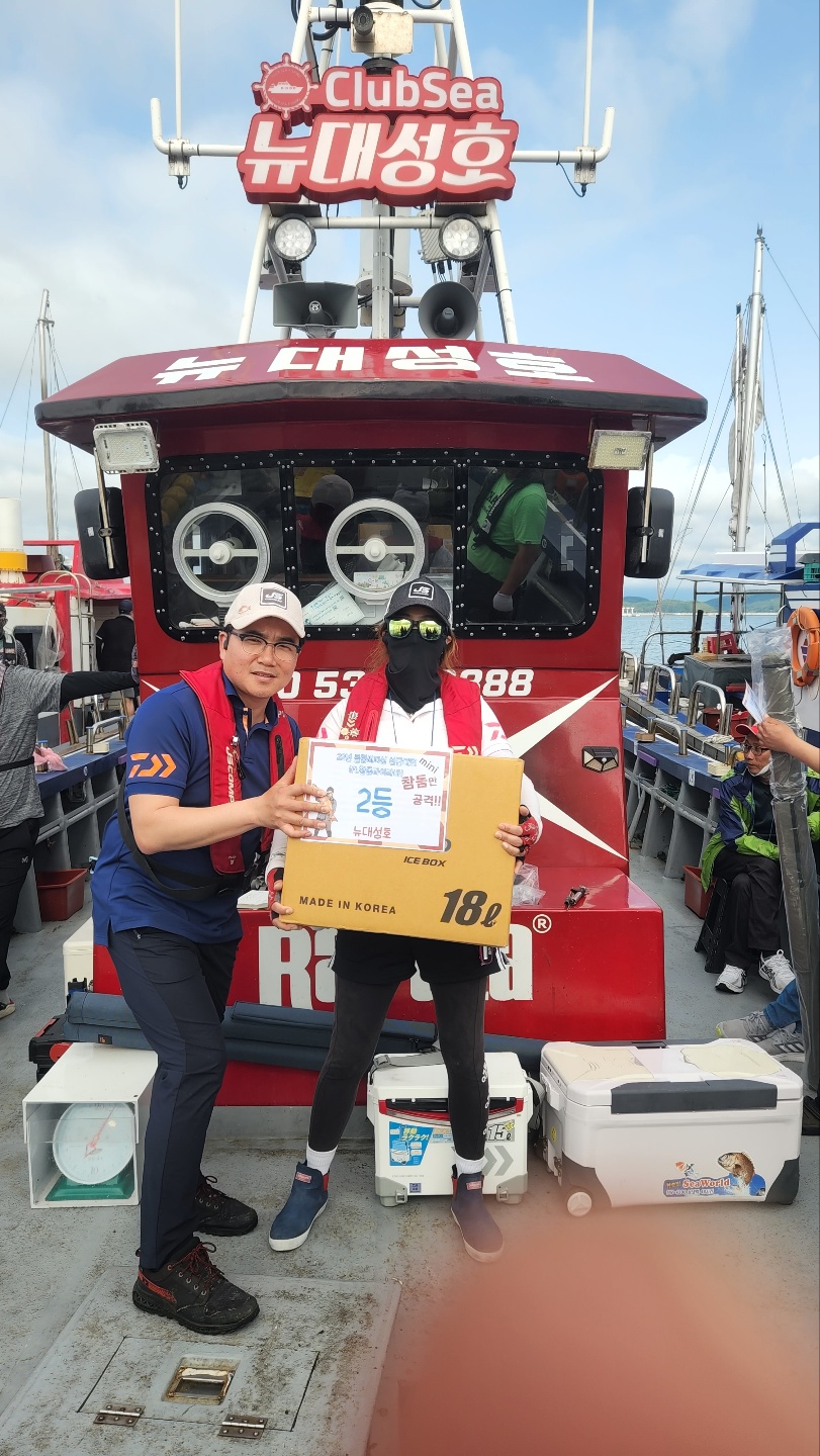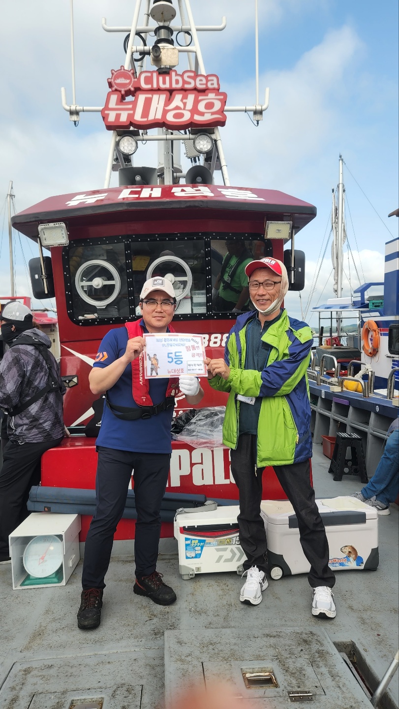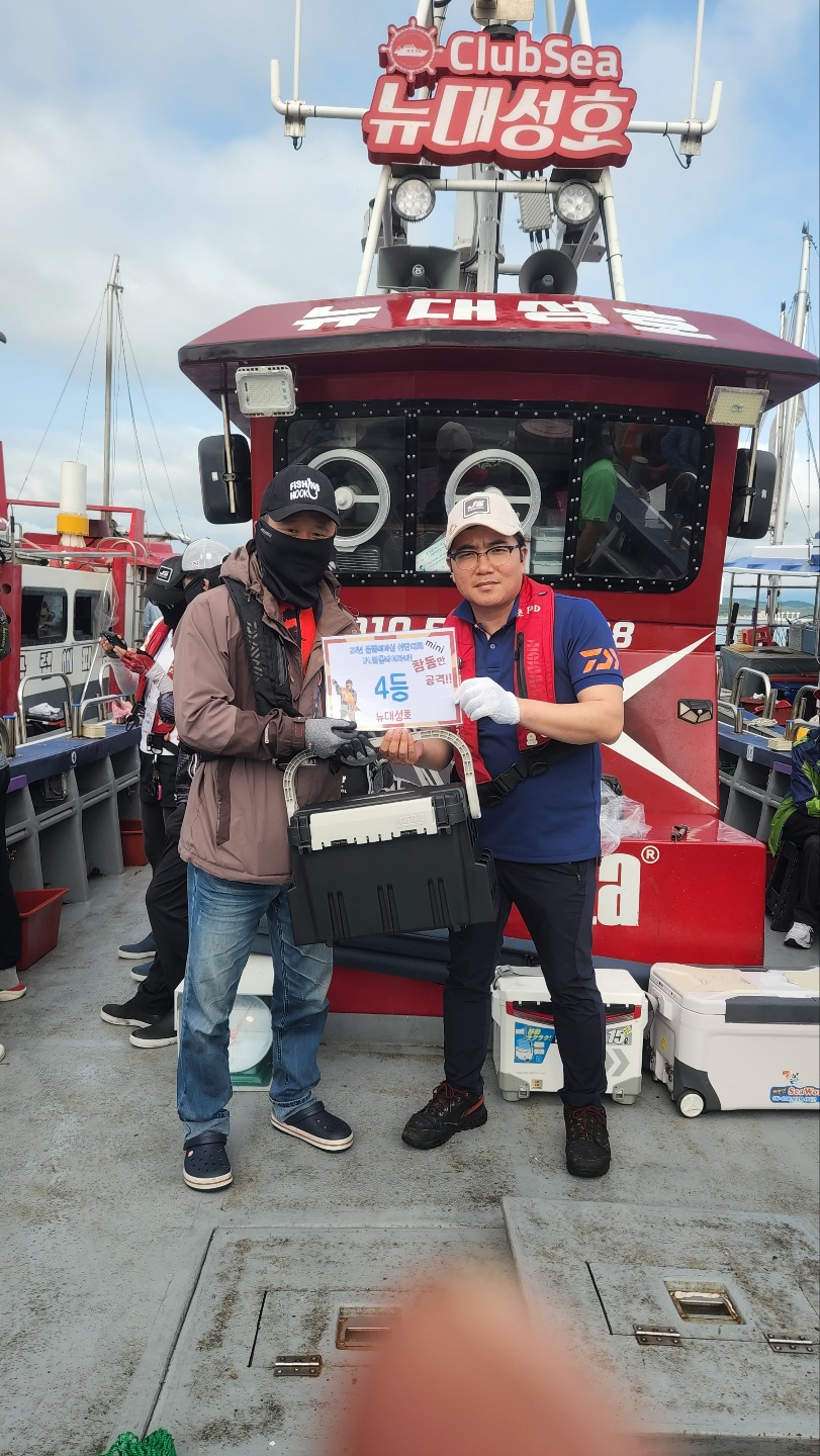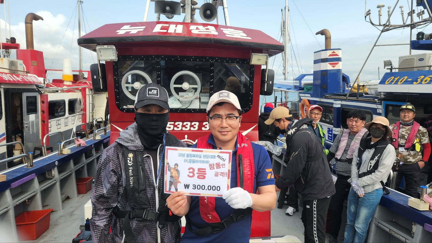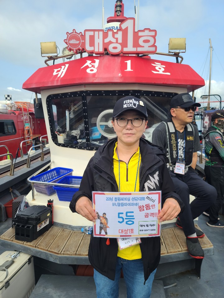 전체 1등 대양호 박종근님!전체 2등 대성1호 백남진님!전체 3등 뉴대성호 한승민님!대성1호 선박 1등부터 5등입니다. 축하드립니다.^^ 축하드립니다. 연장 출조의 힘! 김중화님참돔 처음이신데? 22년 광어 1등의 기운이 아직 남아있나봅니다. 신현수님커플 시상! 축하드립니다. 김현정님사장님 보다 실력이 좋으십니다.^^ 축하드립니다. 차은숙님 레드원호 (블루원양태선장) 1등~5등입니다.연장 출조에도 체력 대단하세요! 축하드립니다. 백운기님축하드립니다^^ 축하드려요! 1(한조사님^^)김두환님!!! 축하드려요!!!!!!!!^.^ 앵글러준님 보고있나유?백승혁님 축하드려요^^   뉴대성호 선박 1등~ 5등입니다.개그맨 피가 흐른.....는... 정삼호님 축하드립니다.^^ 와우!!! 사장님은 전체3등! 사모님이 뉴대 2등까지! 정말 축하드려요~축하드립니다!^^ 뉴대성호에서 한번 더 뵐수 있겠군요!!축하드려요! 피싱훅 화이팅! 박승국님!! 축하드립니다.^^ 대양호 선박 1등 ~ 5등 입니다.역시! 송병수님~ 대회에서도 실력발휘는 계속되시는군요!피싱훅 화이팅~ 이영설님 축하드려요!종순님^^ 표정왜그..래...유? ^^ 우와~ 좋겠다 대양호 무료승선권~~축하드립니다. 최종상님~우와~ 5등 공동수상~ 릴세척은~ 영석 릴닥터로~~^^