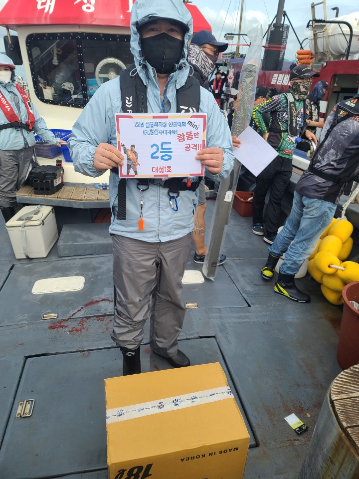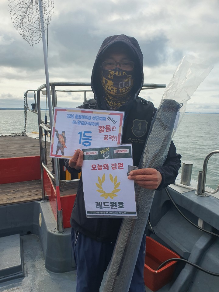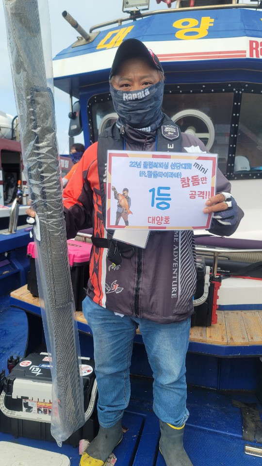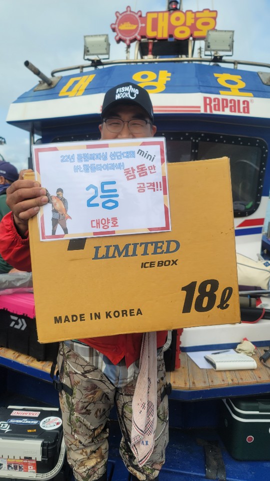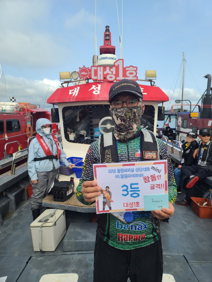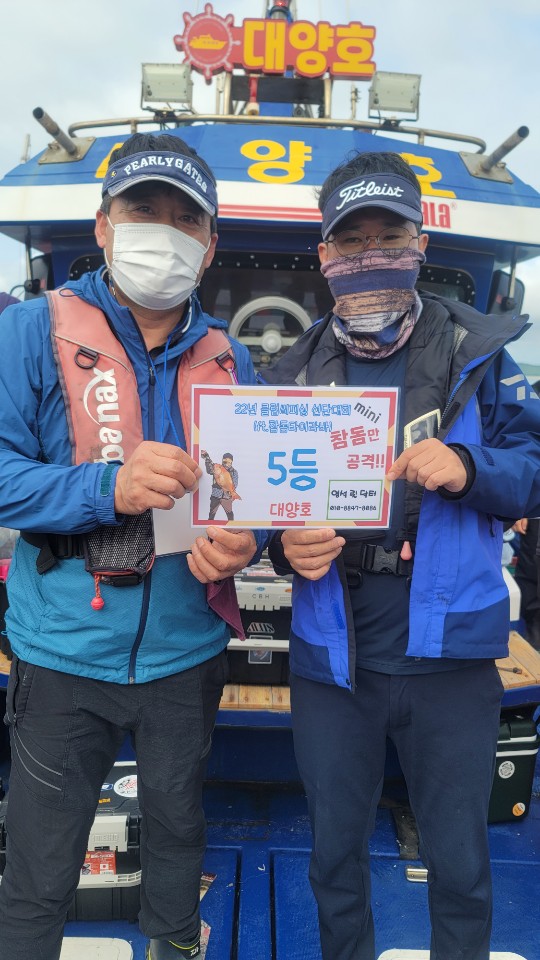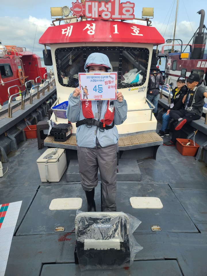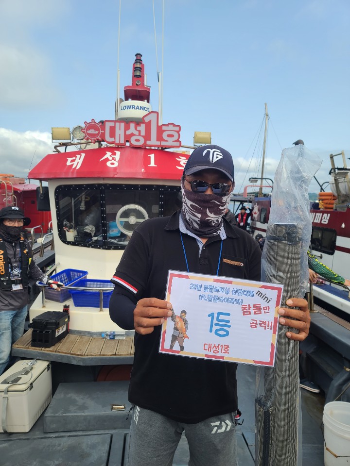 전체 1등 대양호 박종근님!전체 2등 대성1호 백남진님!전체 3등 뉴대성호 한승민님!대성1호 선박 1등부터 5등입니다. 축하드립니다.^^ 축하드립니다. 연장 출조의 힘! 김중화님참돔 처음이신데? 22년 광어 1등의 기운이 아직 남아있나봅니다. 신현수님커플 시상! 축하드립니다. 김현정님사장님 보다 실력이 좋으십니다.^^ 축하드립니다. 차은숙님 레드원호 (블루원양태선장) 1등~5등입니다.연장 출조에도 체력 대단하세요! 축하드립니다. 백운기님축하드립니다^^ 축하드려요! 1(한조사님^^)김두환님!!! 축하드려요!!!!!!!!^.^ 앵글러준님 보고있나유?백승혁님 축하드려요^^   뉴대성호 선박 1등~ 5등입니다.개그맨 피가 흐른.....는... 정삼호님 축하드립니다.^^ 와우!!! 사장님은 전체3등! 사모님이 뉴대 2등까지! 정말 축하드려요~축하드립니다!^^ 뉴대성호에서 한번 더 뵐수 있겠군요!!축하드려요! 피싱훅 화이팅! 박승국님!! 축하드립니다.^^ 대양호 선박 1등 ~ 5등 입니다.역시! 송병수님~ 대회에서도 실력발휘는 계속되시는군요!피싱훅 화이팅~ 이영설님 축하드려요!종순님^^ 표정왜그..래...유? ^^ 우와~ 좋겠다 대양호 무료승선권~~축하드립니다. 최종상님~우와~ 5등 공동수상~ 릴세척은~ 영석 릴닥터로~~^^