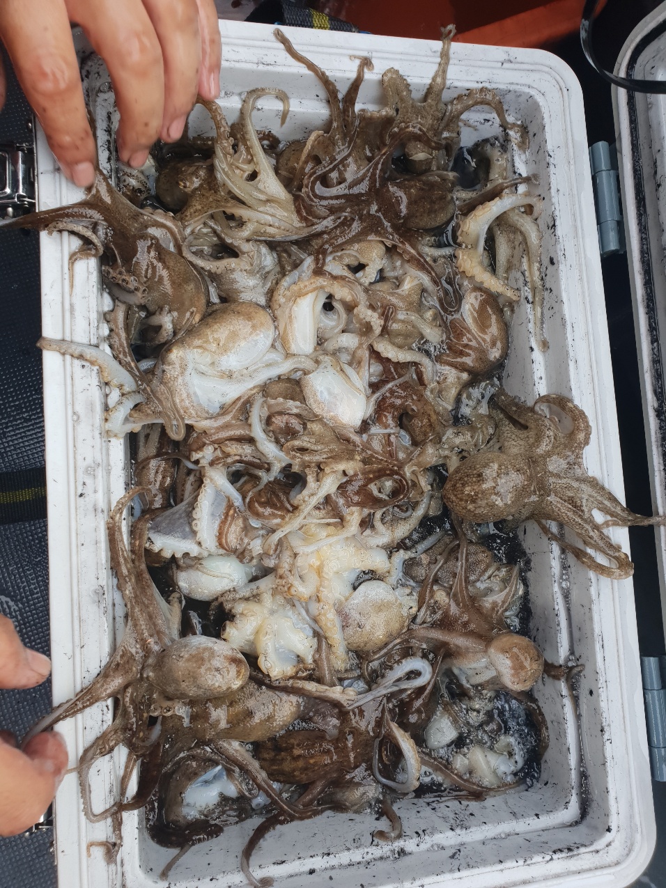 물때가 워낙 좋은 물때로 소문이 나서 그런지 충남배들은 대다수가 출항한 하루였습니다.대천 앞바다까지 가려고 보니 배들이 너무 많아서 그냥 천수만 내에서 했습니다.다행이도 쭈꾸미가 꾸준이 나와주었고 조사님들이 잘 잡아 주셨습니다.수심이 깊어 올리시다 떨어뜨리는게 많다 보니 초보분들과 고수분의 차이가 좀 있었습니다.제일 잘 잡으신분이 10.88키로 쿨로를 가득 채우시고(작은 쿨러긴 했지만...)비교적 잘 잡으신분이 7~8키로평균적으로 5키로 이상 잡았습니다.