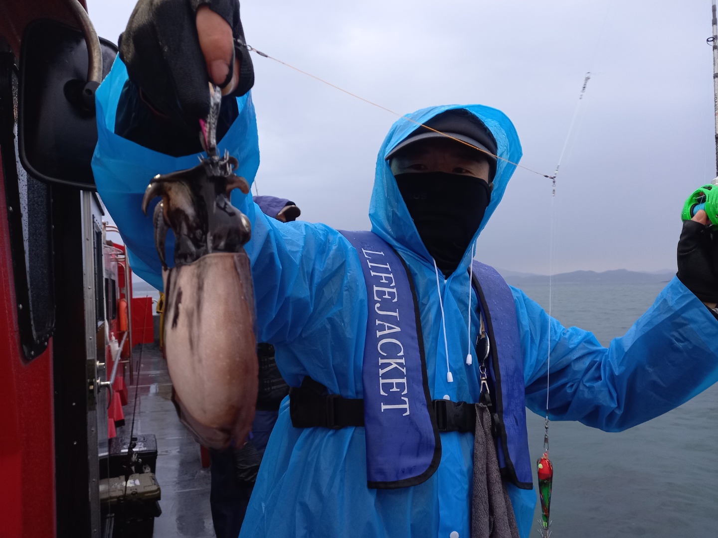 어제 하루종일 고민해서 오늘 출조 결정......ㅎ바람이 심하게 붑니다..ㅠㅠ그래도 이런 날에도 낚시 오시는 조사님들께 조금이라도 더 잡아가시도록 여기저기 돌아다녀봤네요..줄 잡기가 힘들고 쭈꾸미들의 활성도가 떨어져서 조황은 어제의 3/4. 정도로 떨어졌습니다.그나마 씨알이 어제보다 좋고.. 찰박이 갑이들이 좀 나와서 무게는 어제만큼 나온 거 같네요..ㅎ 그래도 오늘이 올 시즌 최저 조황입니다...마지막 조황확인하는데비슷하게 잡으신 분들이 많으셔서 일일이 확인 후 무게 1등.. 마리수 1등.. 두분 뺏지 드렸네요...고생들 많으셨구여... 평소보다 한분한분 신경써드리지 못해서 정말 죄송합니다...