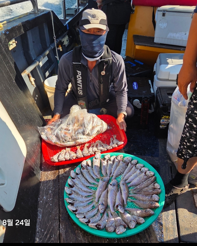 저희수나2호를 찿아주신 조사님들께 감사드립니다. 오늘도 수고 많이 하셨습니다. 8월24일 수나2호 조황사진입니다.  백조기 잡고왔습니다..,