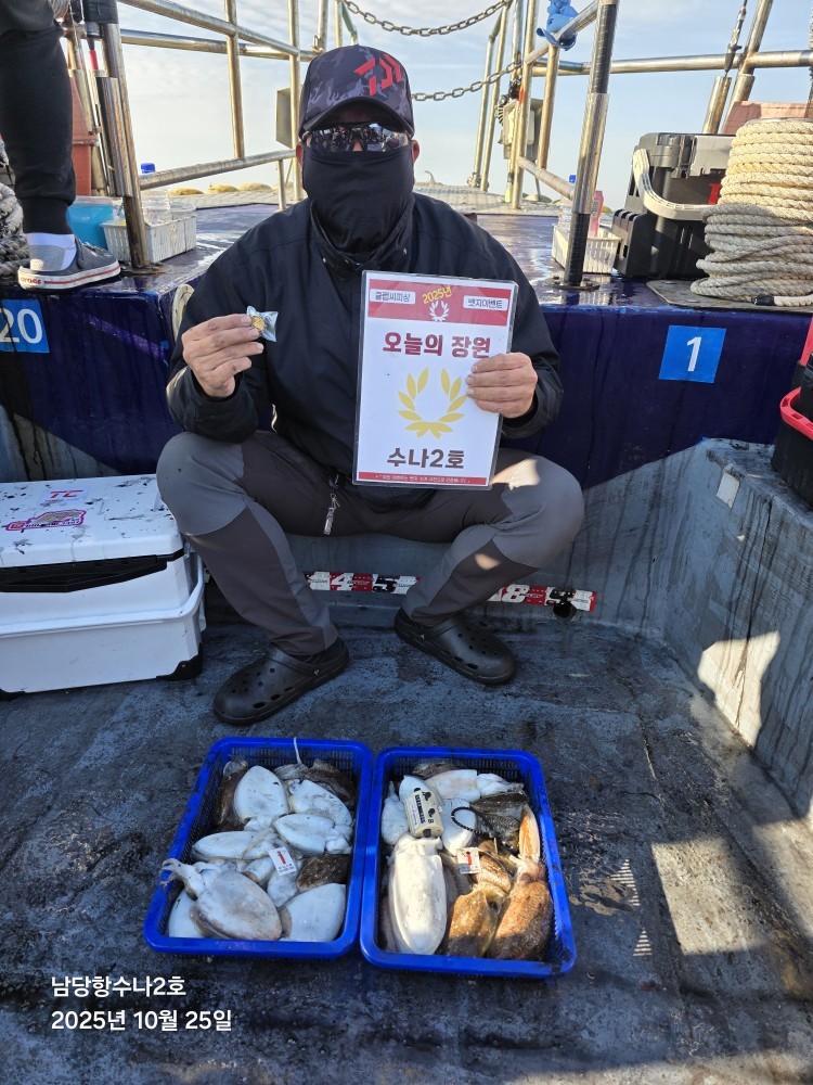 오늘도 마린호는 즐겁게 다녀왔습니다 오전부터 잘 자오지않는 쭈와 숨바꼭질을 하고다녔네요 오늘은 마린호가 졸업식을 마치고 가을 쭈시즌을 무사히 종료하게되었네요 찾아주신 조사님들 넘 감사드리고 마지막까지 함께 해주셔서 너무 감사드립니다오늘 장원 90수로 마무리했으며 다른분들은 20~60수 정도로 마무리했습니다 오늘도 수고하셨습니다 오늘의 장원 김*현님 축하드립니다 오늘또한 간식 ㅎㅎ 감사합니다